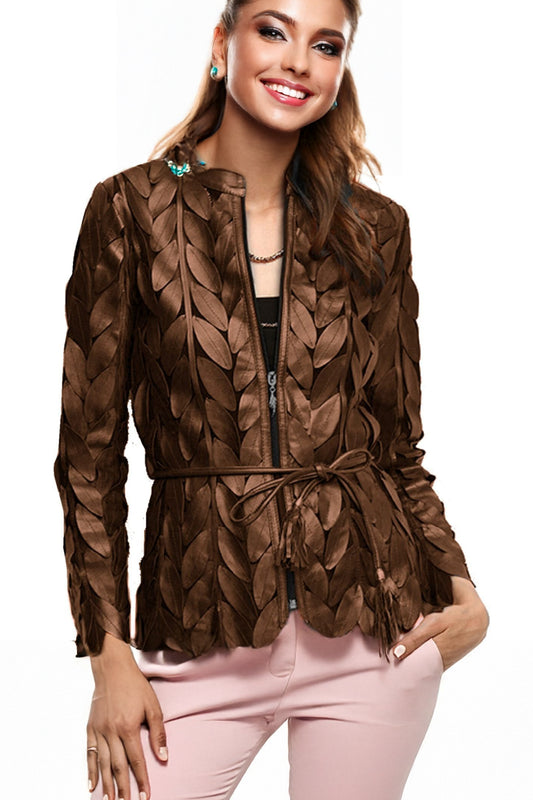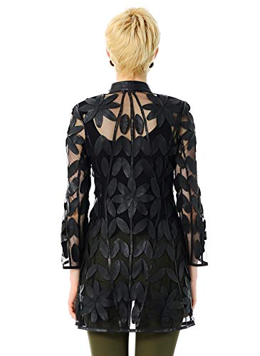 Women's Leaf-shaped Genuine Lambskin Leather pieces Appliqued Mesh Jacket